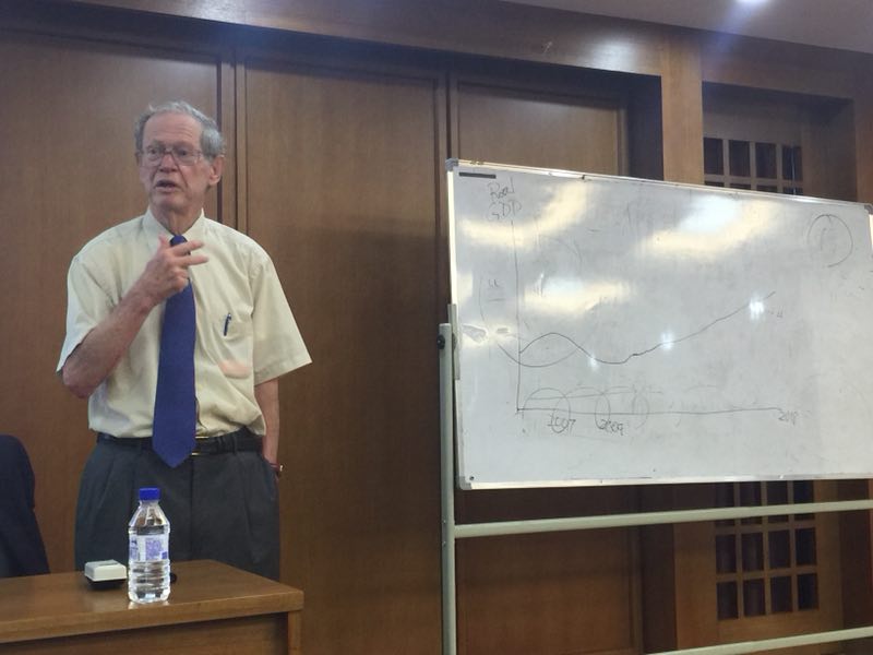 Richard Cooper教授主要从发达国家的视角,以历史、现实与未来的逻辑剖析了世界经济面临的挑战与发展趋势。Cooper教授基于美国、欧洲与日本2006-2018年实际GDP走势图和失业率数据指出,2008年的经济衰退是历史上严重的一次衰退,在2009年末达到最低点,之后经济开始平稳复苏。2008年金融危机中货币政策和财政政策的掌控都比较好,因此2008年的经济衰退与1931年的“经济大萧条”相比情况要好得多。然而,按历史标准来说,虽然经济开始复苏,但本轮复苏相对疲弱。美国大概每隔十几年就有一次经济衰退,将本轮危机和其他危机相比较,可以发现美国经济复苏远低于正常复苏水平。危机后经历二次衰退的欧洲,2017年才恢复到此前的峰值水平,欧洲整体的经济复苏程度甚至比美国还要低。日本的经济在整个时期有起伏,2013年的经济复苏效果显著,2017年日本经济也表现出向好趋势。